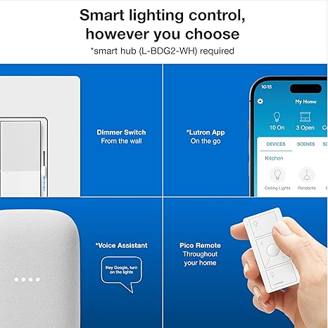 - CONTROL WITH THE LUTRON APP: Manage your lights anywhere with the Lutron app; control lighting and advanced smart features such as scenes, scheduling, geofencing, smart-away, timers, app control, and more
